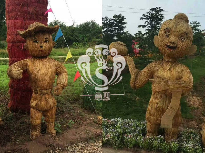 現在的精致稻草人藝術通常是由專業美術老師的造型放樣,然后由焊工師傅焊接出立體造型造型,然后以稻草或者稻草繩為材料編捆制作而成。
